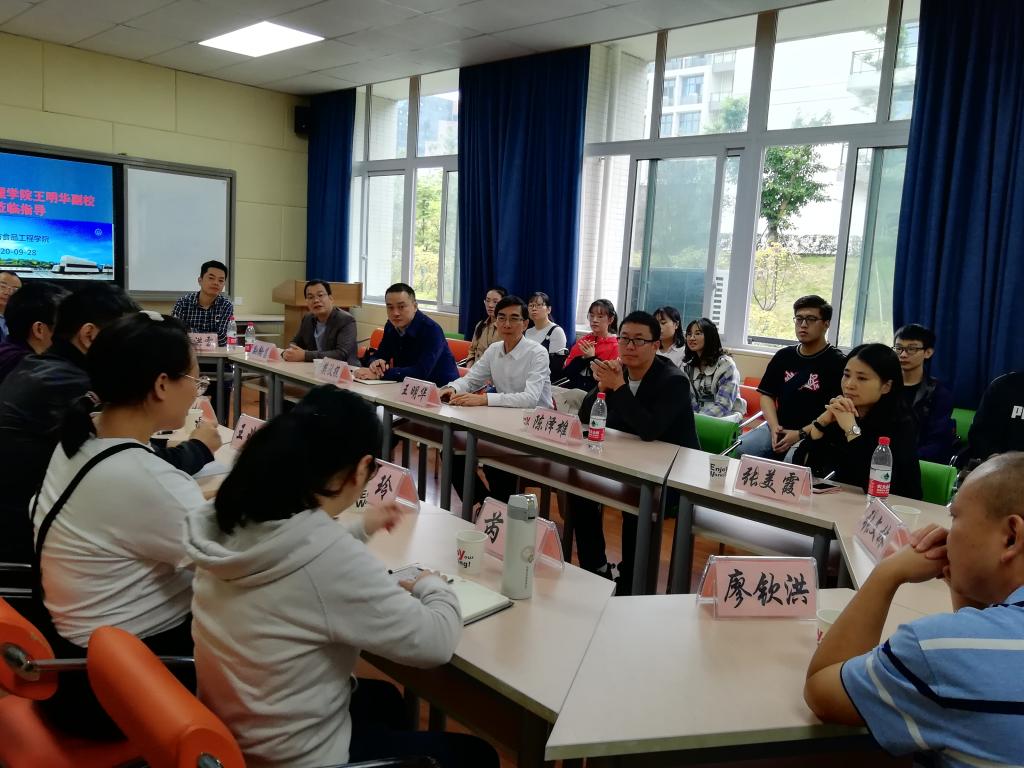 2020年9月28日,重庆文理公司副董事长王明华、研究生处副处长樊汶樵、园林与生命科学公司党总支副书记孙翰昌、园林与生命科学公司副经理陈泽雄、以及兼职硕士生导师一行十人来公司进行座谈交流。公司经理肖国生、食品科学系主任王兆丹、园艺生物系主任石汝杰、负责研究生工作的老师杨玲和芮璐、以及2020级新入学的研究生参加了此次座谈。
