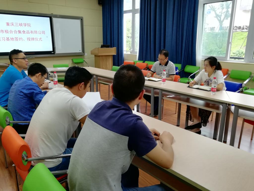 2019年6月17日,太阳集团tyc151与重庆市极合合集食品有限公司共建实习基地的签约授牌仪式在公司举行,重庆市极合合集食品有限公司陈俊逸总监、周玉兰经理和公司经理肖国生、示范中心主任曲留柱、实验室主任唐华丽、学工办主任李华林出席了签约授牌仪式。