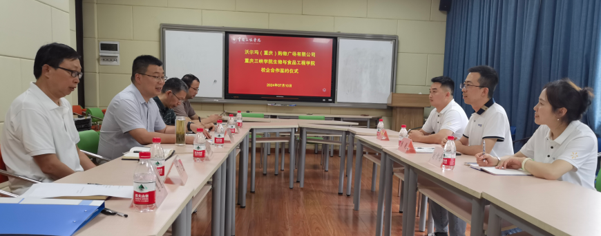 7月10日下午,公司与沃尔玛(重庆)购物广场有限公司举行校企合作签约仪式。沃尔玛重庆公司人力资源经理杨锐一行3人,公司班子成员,学工办和教学示范中心负责人参会。党总支书记骆孟鑫主持会议。