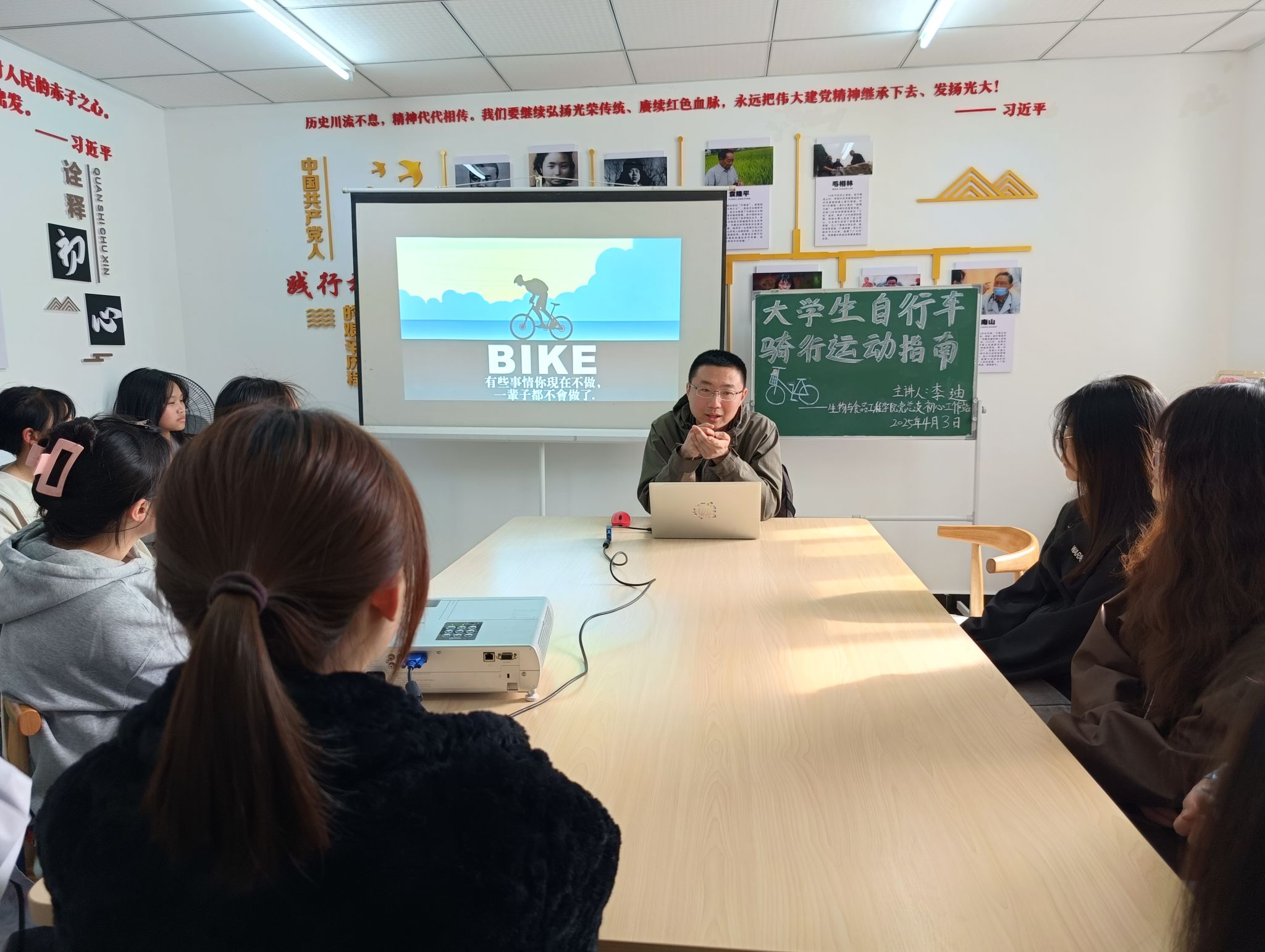 活动伊始,李迪老师先是向同学们讲述了自己对于骑行运动从接触到喜爱的一系列心路历程,然后从骑行历程、骑行的好处、骑行扫盲、老骑友的忠告五个方面详细地向同学们进行分享。向同学展示要如何学习骑自行车、骑好自行车的小技巧以及骑行中的注意事项。还有针对骑行设备,老师也向同学们介绍了各种自行车及其品牌,并用《岳阳楼记》中的名句“不以物喜,不以己悲”告诫同学们不要有攀比心理,明确自己的定位,设备适合自己最重要。最后,李迪老师告诉同学们有些事情现在不做,以后可能都不会做了,所以要珍惜老员工活,抓住机会。