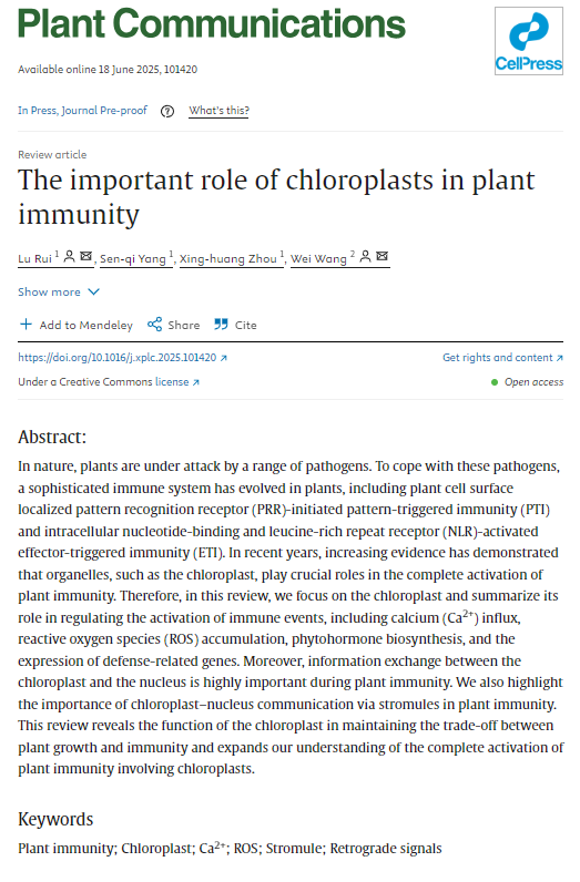 近日,太阳集团tyc151教师芮璐以第一作者和共同通讯作者身份,与福建农林大学王伟教授合作在植物学国际卓越期刊《Plant Communications》(中国科公司一区TOP期刊,最新影响因子11.6)上发表题为《The important role of chloroplasts in plant immunity》的综述论文。该论文系统总结了近年来叶绿体在调控钙离子内流、活性氧(ROS)积累、植物激素生物合成以及叶绿体—细胞核逆行信号等免疫激活事件中的核心作用,阐释了叶绿体在维持植物生长与免疫平衡方面的重要功能,拓展了植物免疫系统中涉及叶绿体通路全面激活的理解视角,对未来抗病植物分子育种提供了理论依据与研究方向。