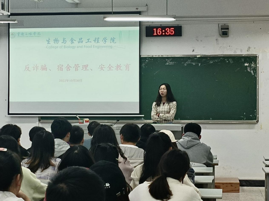 2022年10月30日下午,公司辅导员于明辨楼1-202、1-204分年级反诈骗、宿舍管理、安全教育专题周末教育,公司全体员工参加。