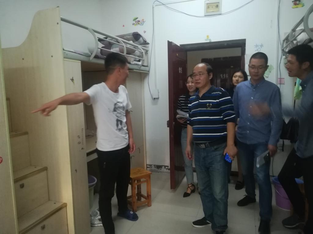谭力书记查访员工寝室,关心地询问同学们的学习及生活情况,提醒同学们注意寝室用电安全等问题并对寝室卫生提出要求。通过交谈,谭书记了解到同学们的生活日常,亲切地与同学们分享他的老员工活,给同学们送去了国庆问候,并提醒大家注意节日安全。