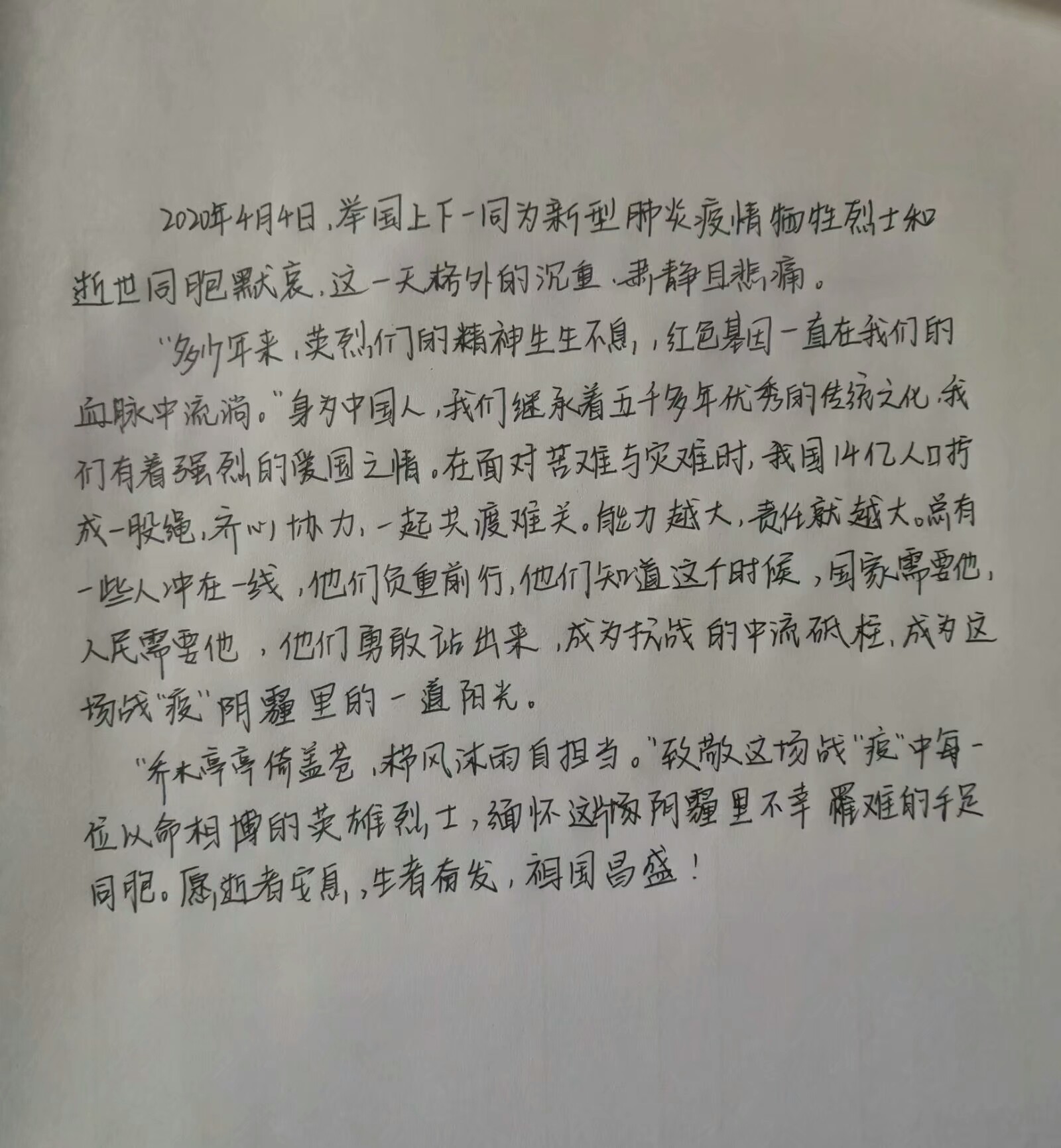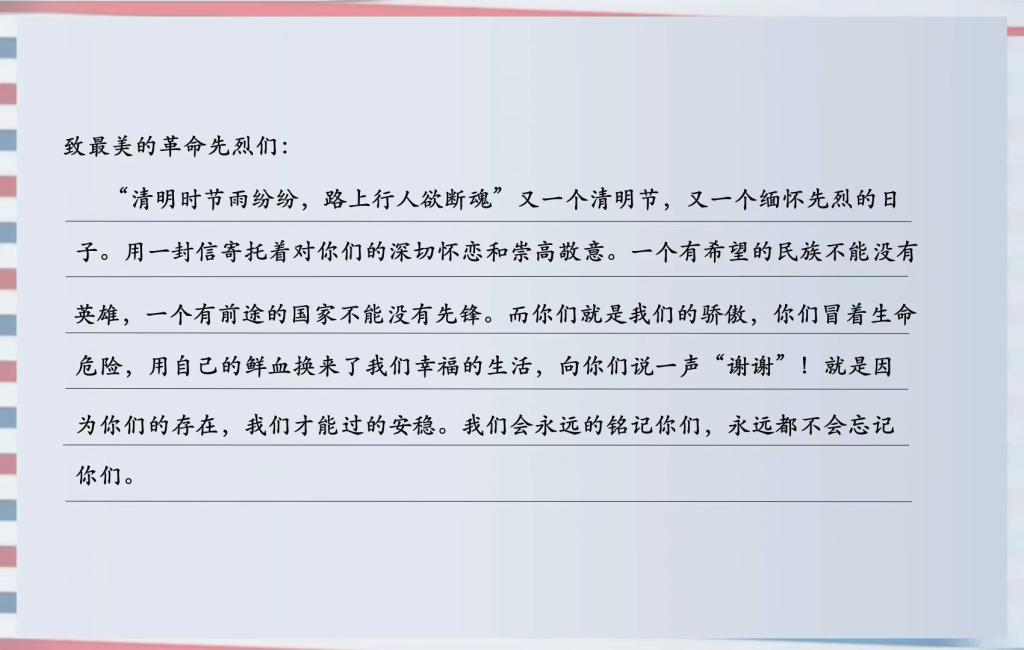 4月5日,公司发布第十七弹线上打卡活动:疫情期间心得分享,打卡方式多样:可选择视频、音频、手写照片、电子档等。为表达对抗击新冠肺炎疫情牺牲烈士和逝去同胞的深切哀悼,同学们通过打卡活动吐露心中情感,寄托哀思,缅怀同胞,体现了同学们对英雄烈士的敬意,传递同学们的爱国之情。随后,公司通过团总支微信公众号分享同学们的所闻、所见、所感,鼓励更多同学的积极参与,让同学们在活动中互相交流,从中得到感悟。