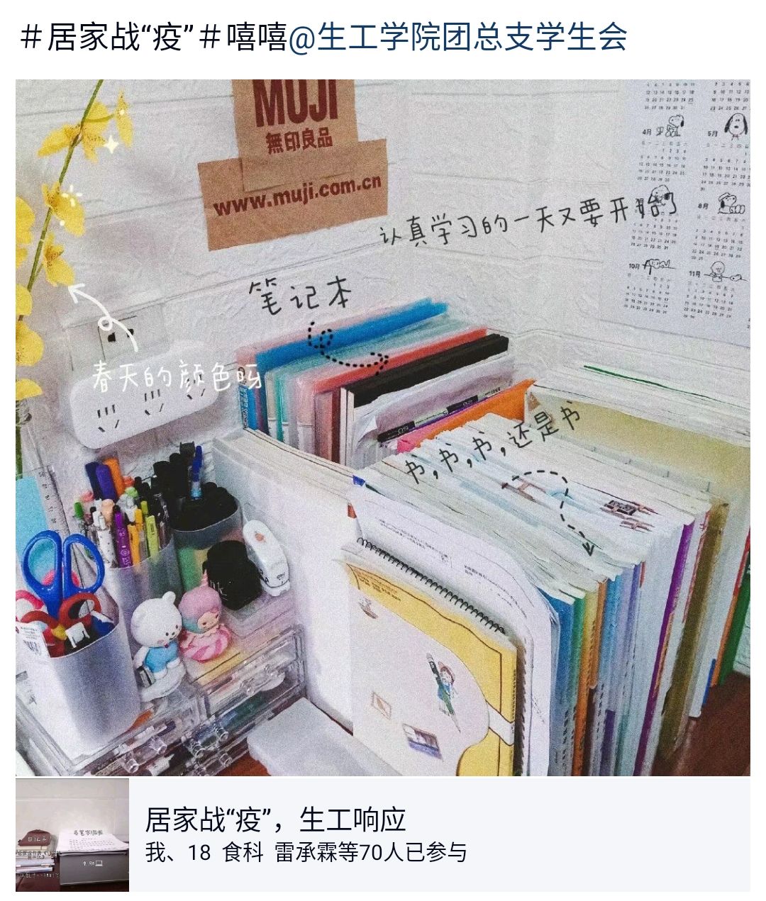 此次打卡活动增强了同学们的创新意识,锻炼了同学们的动手能力。让同学们学会营造一个舒适的学习环境。疫情已经好转,希望同学们能够满载学习成果,重回美丽三院。(生工公司 潘传青 李华林)