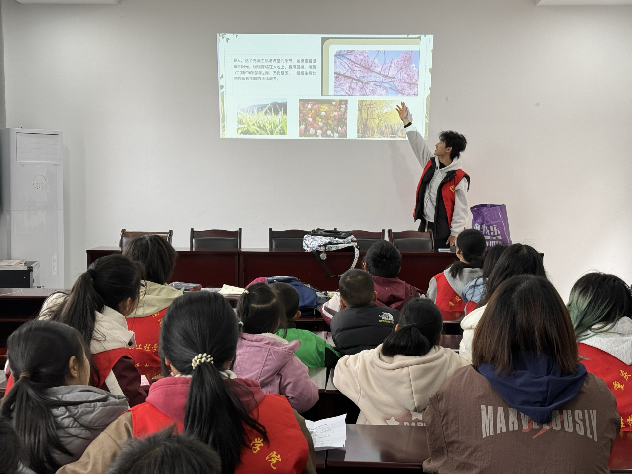活动中,志愿者们先以“一对一”模式为小朋友辅导功课,耐心解答学科作业难题、检查作业等。志愿者代表摆脱传统说教模式,借助趣味视频,以及发生在身边的事例,向小朋友们展示了春天大自然的有趣变化。互动环节,“生活中春天带来的变化”激发小朋友们的兴趣,大家争先回答举例;模拟情景体验让他们直观感受到大自然的奥妙,活动现场气氛热烈。