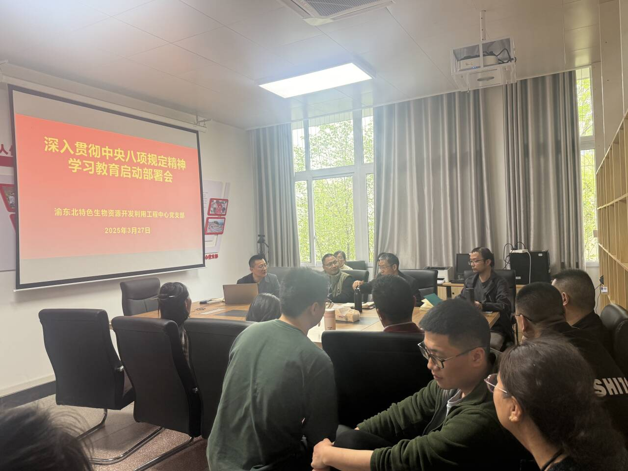 2025年3月27日,渝东北特色生物资源开发利用工程中心党支部在慎思2-217召开党员大会部署深入贯彻中央八项规定精神学习教育,党支部书记赵峰同志主持部署会并作学习动员讲话,指出要按照党中央、市教委、公司党委和公司党总支的要求,扎实搞好此次学习教育活动。会议期间还研讨了“样板支部”建设工作,党支部党员肖国生、甘丽萍等同志就本学期党员学习活动提出建议,其余与会党员热烈讨论。