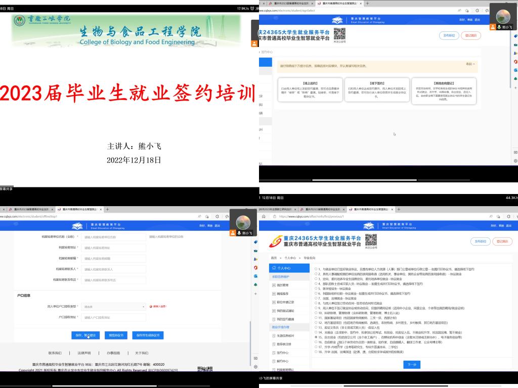 会上,熊小飞登录重庆市普通高校毕业生智慧就业平台,主要围绕简历管理和签约中心两个板块展开演示和讲述,引导同学们做好个人求职信息维护和就业手续办理。同时,鼓励未就业同学,积极主动关注就业讯息、投递简历、参加面试,争取实现稳步就业。(熊小飞)