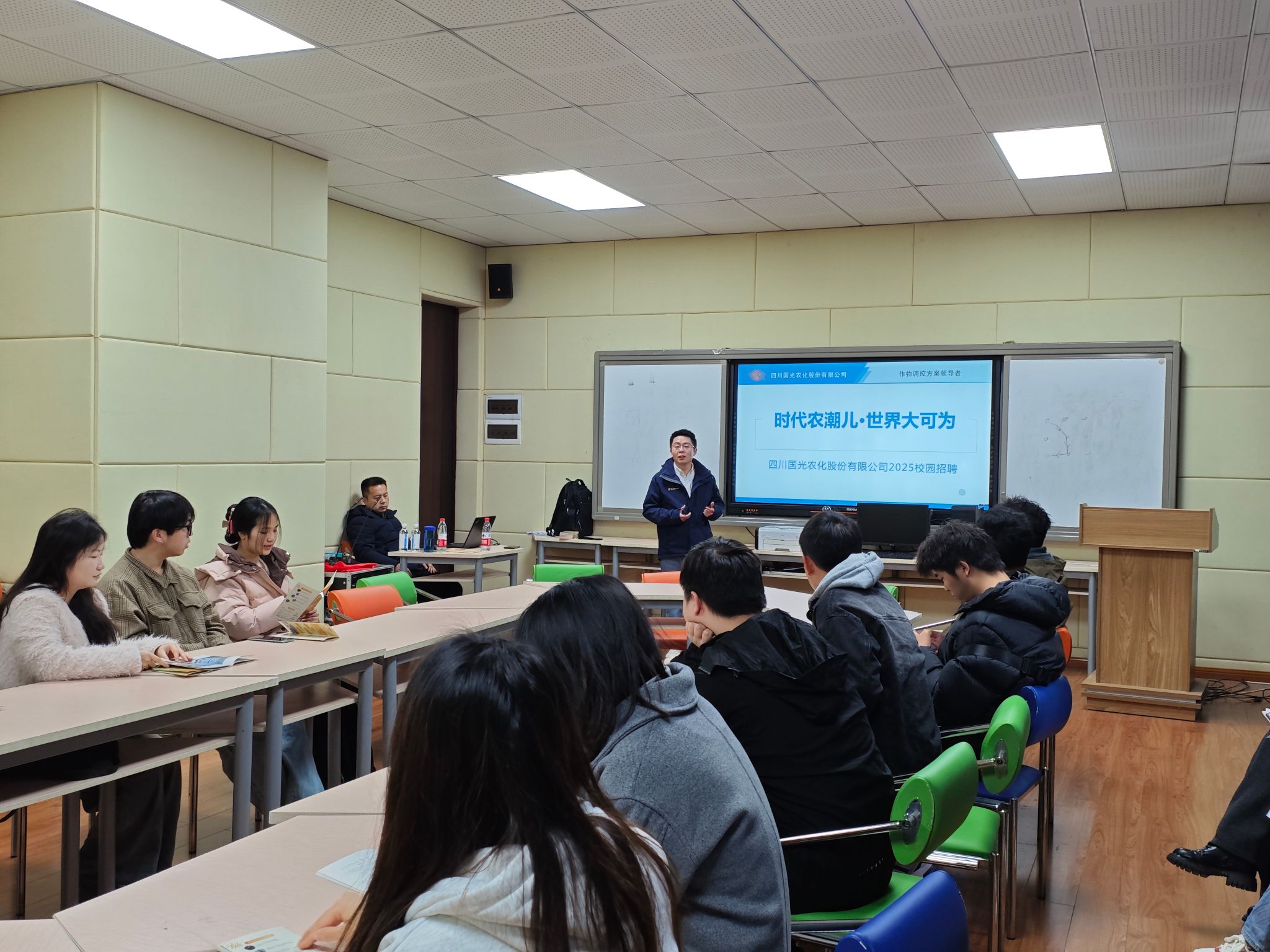 为搭建校企供需对接平台,推动人才培养与产业需求精准衔接,2025年3月14日,四川国光农业科技有限公司受邀走进太阳集团tyc151,开展“企业进校园”校企合作交流暨专场招聘活动。生工公司党总支书记骆孟鑫、副书记陈文剑、学工办主任闫兴运及数十名师生代表参与活动,四川国光农业人力资源经理张兴代表企业到校对接洽谈。